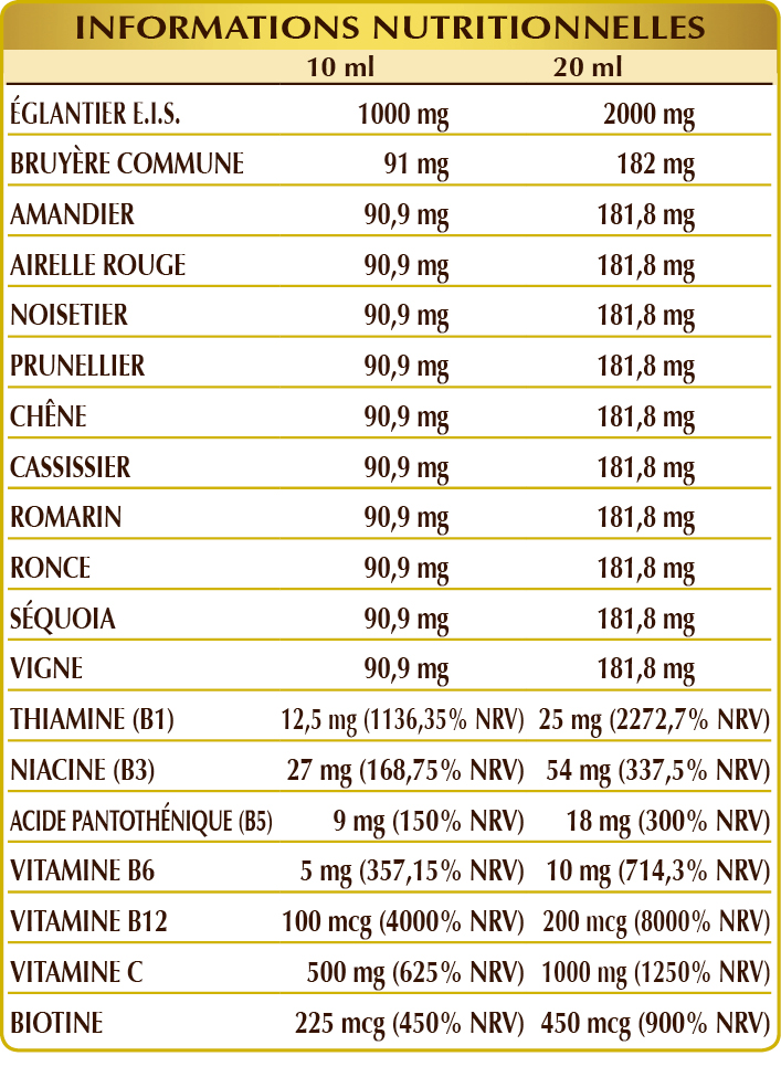 Glycérine végétale bi-distillée, eau pure, églantier (Rosa canina) fruits E.I.S. (titré à 50% de vitamine C) ; macérat glycérique de tissus méristématiques frais de : bruyère commune (Calluna vulgaris) jeunes pousses, amandier (Prunus amygdalus ou Prunus dulcis) bourgeons, myrtillier rouge (Vaccinium vitis-idaea) jeunes pousses, noisetier (Corylus avellana) bourgeons frais, prunellier (Prunus spinosa) bourgeons, chêne (Quercus peduncolata ou Quercus robur) bourgeons, cassissier (Ribes nigrum) bourgeons, romarin (Rosmarinus officinalis) jeunes pousses, ronce ou mûrier sauvage (Rubus fruticosus) jeunes pousses, séquoia (Sequoia gigantea ou Sequoiadendron giganteum) bourgeons, vigne (Vitis vinifera) bourgeons ; vitamine B1 (chlorhydrate de thiamine), vitamine B3 (niacine, nicotinamide), vitamine B5 (pantothénate de calcium), vitamine B6 (pyridoxal-5-phosphate), biotine, vitamine B12 (méthylcobalamine, 5'-désoxyadénosylcobalamine).