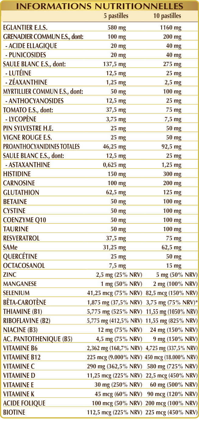 Églantier (Rosa canina) fruits E.I.S. (titré à 50% de vitamine C), cellulose microcristalline°, phosphate de calcium dibasique, (L-)histidine, rose d'inde (Tagetes erecta) têtes de fleurs E.S. (titré à 10% de lutéine), gomme arabique°, (L-)carnosine, vitamine E d'origine végétale (D-α-acétate de tocophéryle), glutathion réduit, SAMe (S-adénosyl méthionine disulfate tosylate), dioxyde de silicium°°, bétaïne, (L-)cystine, coenzyme Q10, grenade (Punica granatum) écorces de fruits E.S. (titré à 40% d’acide ellagique), grenadier commun (Punica granatum) écorces des fruits E.S. (titré à 40% de punicosides), myrtillier commun (Vaccinium myrtillus) fruits E.S. (titré à 25% d’isoflavones), taurine, resvératrol d'origine végétale, tomate (Solanum lycopersicum) fruit E.S. (titré à 10% delycopène), quercétine, pin sylvestre (Pinus pinaster) écorces E.S. (titré à 90% de proanthocyanidine oligomérique), vigne rouge (Vitis vinifera) graines E.S. (titré à 95% de proanthocyanidines oligomériques), stéarate de magnésium d'origine végétale°°, gluconate de zinc, dunaliella (Dunaliella salina) thalle (algue) E.S. (titré à 10% de bêta-carotène), haematococcus (Haematococcus pluvialis) thalle (algues) E.S. (titré à 5% d’astaxanthine), rose d'Inde (Tagetes erecta) têtes des fleurs E.S. (titré à 10% de zéaxanthine), policosanols de canne à sucre (extrait titré à 60% d’octacosanol), vitamine B3 (inositol hexanicotinate, nicotinamide), vitamine B2 activée (riboflavine-5-phosphate de sodium), gluconate de manganèse, vitamine B1 (chlorhydrate de thiamine), vitamine B5 (pantothénate de calcium), vitamine B6 activée (pyridoxal-5-phosphate), lichen (Cladonia rangiferina) thalle E.S. (titré en vitamine D3 cholécalciférol 100 000 UI/g), biotine, vitamine B12 activée (5-désoxyadénosylcobalamine, méthylcobalamine), acide folique activé (L-méthylfolate de calcium), sélénite de sodium, vitamine K1 (phylloquinone), vitamine D2 (ergocalciférol) d'origine végétale (extrait de la canne à sucre). °Agent de charge °°Agent antiagglomérant