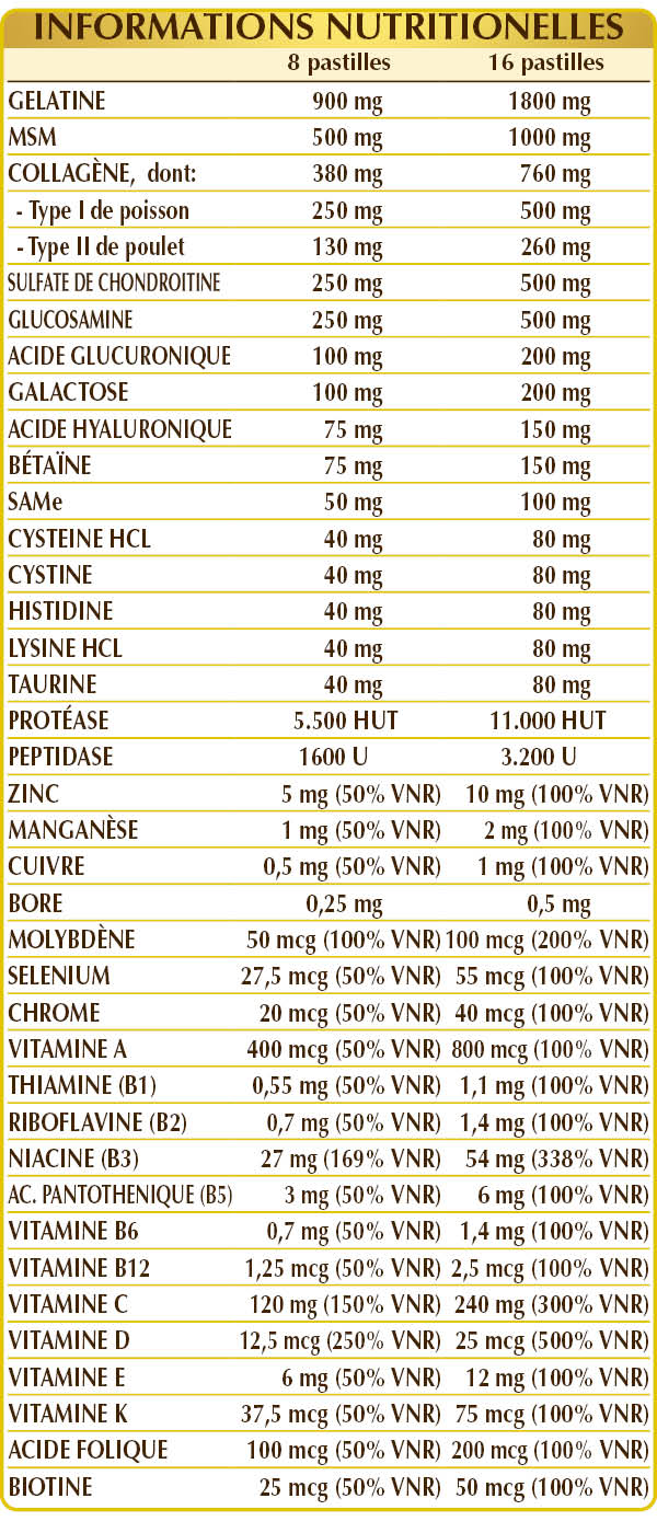 Gélatine alimentaire (peau bovine), MSM (méthylsulfonylméthane), sulfate de D-glucosamine (par fermentation), sulfate de chondroïtine (d’origine bovine), collagène de type I issu de gélatine hydrolysée de poisson granulée, collagène de type II issu de cartilage hydrolysé de poudre de poulet (à 52 %), cellulose microcristalline°, gomme arabique°, vitamine C (acide ascorbique), glucuronate de sodium, galactose (d’origine végétale), SAMe (S-adénosyl méthionine disulfate tosylate), dioxyde de silicium°°, bétaïne, hyaluronate de sodium, gluconate de zinc, cystéine HCL ou chlorhydrate (L-), cystine (L-), histidine (L-), lysine HCL ou chlorhydrate (L-), taurine, stéarate de magnésium d’origine végétale°°, vitamine B3 (inositol hexanicotinate), vitamine E d’origine végétale (acétate de D-α-tocophéryle), protéase (500 000 HUT/g), gluconate de manganèse, peptidase (200 000 U/g), lichen (Cladonia rangiferina) thalle E.S. (titré en vitamine D3 cholécalciférol 100 000 UI/g), gluconate de cuivre, vitamine B5 (pantothénate de calcium), vitamine A (acétate de rétinyle), borate de sodium, vitamine B2 activée (riboflavine 5-phosphate de sodium), vitamine B6 activée (pyridoxal-5-phosphate), vitamine B1 (chlorhydrate de thiamine), picolinate de chrome, molybdate de sodium, acide folique activé (L-méthylfolate de calcium), sélénite de sodium, vitamine K1 (phylloquinone), biotine, vitamine B12 activée (5-désoxyadénosylcobalamine, méthylcobalamine). E.S. = Extrait Sec °Agent de charge. °°Antiagglomerante.