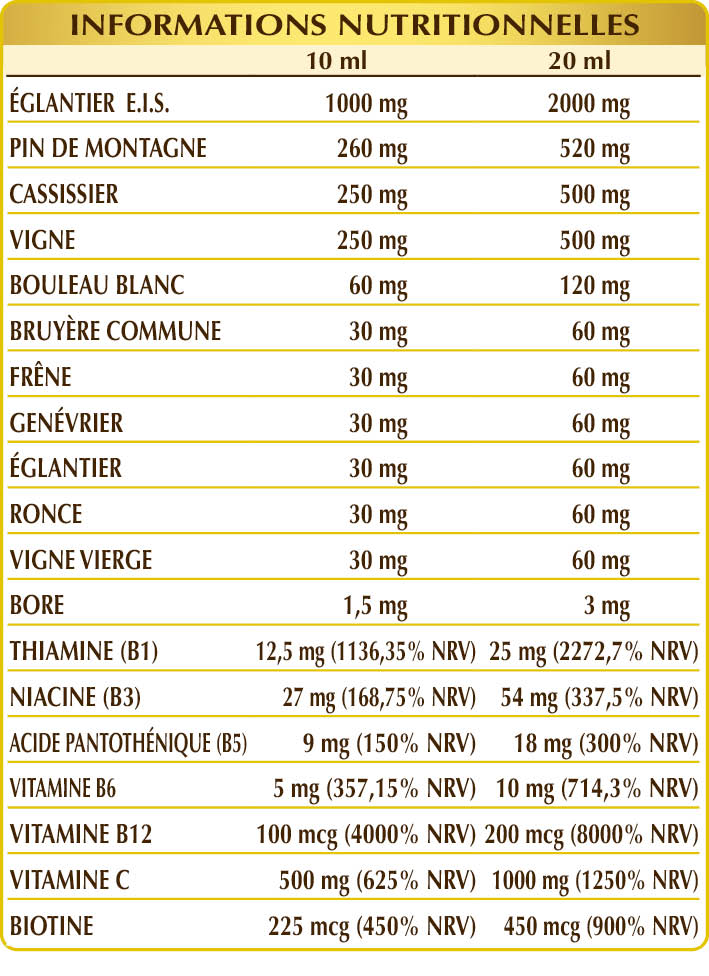 Glycérine végétale bi-distillée, eau pure, églantier (Rosa canina) fruits E.I.S. (titré à 50% en vitamine C) ; macérat glycérique de tissus méristématiques frais de : pin sylvestre (Pinus montana ou Pinus mugo) bourgeons, cassissier (Ribes nigrum) bourgeons, vigne (Vitis vinifera) bourgeons, bouleau blanc (Betula alba ou Betula pendula) bourgeons et sève, bruyère (Calluna vulgaris) jeunes pousses, frêne (Fraxinus excelsior) bourgeons, genévrier (Juniperus communis) jeunes pousses, églantier (Rosa canina) jeunes pousses, ronce ou mûrier sauvage (Rubus fruticosus) jeunes pousses, vigne vierge (Ampelopsis veitchii ou Parthenocissus tricuspidata) jeunes pousses ; vitamine B1 (chlorhydrate de thiamine), vitamine B3 (niacine, nicotinamide), borate de sodium, vitamine B5 (pantothénate de calcium), vitamine B6 (pyridoxal-5-phosphate), biotine, vitamine B12 (méthylcobalamine, 5'-désoxyadénosylcobalamine).