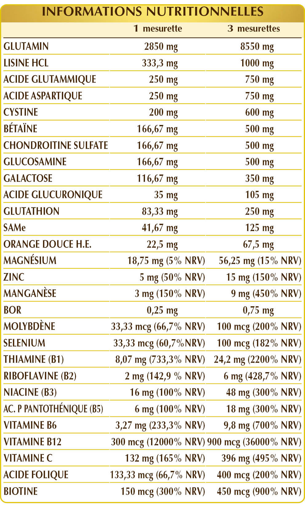 (L-)glutamine, maltodextrines de maïs ou de riz, (L-)lysine HCL ou chlorhydrate, (D-)glucosamine sulfate (issue de fermentation), acide (L-)glutamique, acide (L-)aspartique, (L-)cystine, fructose 1,6-diphosphate, bétaïne, chondroïtine sulfate (d’origine bovine), glycéro-phosphate de magnésium, vitamine C (acide ascorbique), (D-)galactose d’origine végétale, SAMe (S-adénosyl méthionine disulfate tosylate), glutathion réduit, gluconate de zinc, glucuronate de sodium, gluconate de manganèse ; arôme naturel : orange douce (Citrus aurantium var. sinensis ou dulcis) écorces de fruits O.E., vitamine B3 (nicotinamide) ; vitamine B1 (chlorhydrate de thiamine), vitamine B5 (pantothénate de calcium), vitamine B6 activée (pyridoxal-5-phosphate), vitamine B2 activée (riboflavine 5-phosphate sodique) ; édulcorants d’origine naturelle : glycosides de stéviol issus de la stévia, thaumatine ; borate de sodium, vitamine B12 activée (5-désoxyadénosylcobalamine, méthylcobalamine), biotine, acide folique activé (L-méthylfolate de calcium), molybdate de sodium, sélénite de sodium