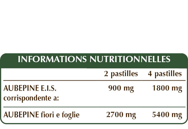 Aubépine (Crataegus oxyacantha) fleurs et feuilles E.I.S., cellulose microcristalline°, gomme arabique°, dioxyde de silicium°°, stéarate de magnésium d’origine végétale°°
