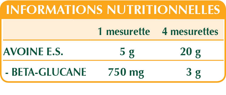 L'avoine possède une teneur élevée en bêta-glucanase, substance contribuant au métabolisme du cholestérol en aidant à en maintenir un niveau normal dans le sang*. L'avoine aide également à régulariser le transit intestinal, il a une action émolliente et apaisante sur le système digestif et favorise le bien-être mental et la relaxation en cas de stress.