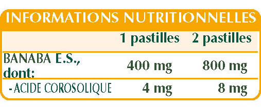Banaba (Lagerstroemia speciosa) feuilles E.S. (standardisé à 1% d’acide corosolique, cellulose microcristalline°, gomme arabique°, dioxyde de silicium°, stéarate de magnésium d’origine végétale°°.