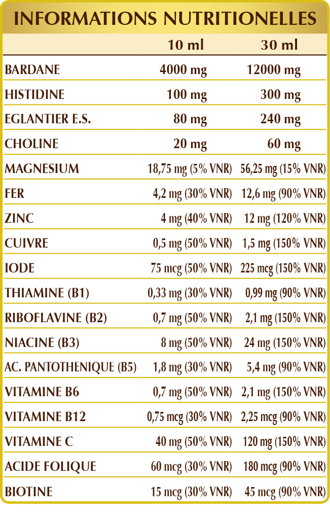 Eau pure, bardane (Arctium lappa) herbe et racines fraîches E.I.L., glycérine végétale bidistillée, glycérophosphate de magnésium, (L-)histidine, églantier (Rosa canina) fruits E.I.S. (titré à 50% de vitamine C), Rgluconate de zinc, citrate ferrique d’ammonium, choline HCL ou chlorhydrate, vitamine B3 (nicotinamide) ; édulcorants d’origine naturelle : glycosides de stéviol de stévia, thaumatine ; sulfate de cuivre, vitamine B5 (pantothénate de calcium), vitamine B2 activée (riboflavine 5-phosphate de sodium), vitamine B6 activée (pyridoxal-5-phosphate), vitamine B1 (thiamine), iodure de potassium, acide folique activé (L-méthylfolate de calcium), biotine, vitamine B12 activée (5-désoxyadénosylcobalamine, méthylcobalamine).
