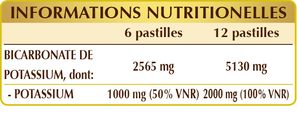 Les compléments alimentaires ne doivent pas se substituer à une alimentation variée et équilibrée et doivent être utilisés dans le cadre d'un mode de vie sain. Ne dépassez pas la dose quotidienne recommandée. Le produit doit être conservé hors de la portée des enfants de moins de trois ans. Pour un apport en potassium avec une dose journalière égale ou supérieure à 1000 mg il est conseillé de consulter un médecin. L'ingestion simultanée de certains médicaments peut à son tour interférer avec la rétention de potassium dans l'organisme. L'utilisation n'est pas recommandée chez les enfants