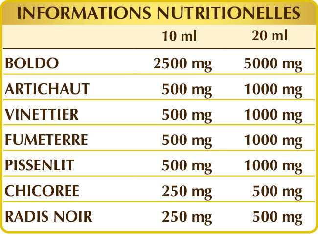Glycérine végétale bi-distillée, eau pure, boldo (Peumus boldus) feuilles E.I.L., artichaut (Cynara scolymus) feuilles E.I.L., vinettier (Berberis vulgaris) écorces des racines E.I.L., fumeterre (Fumaria officinalis) herbe avec des fleurs E.I.L., pissenlit (Taraxacum officinale) racines E.I.L., chicorée (Cichorium intybus) racines E.I.L., raifort (Raphanus sativus var. niger) racines E.I.L.