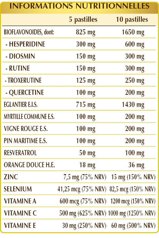 Églantier (Rosa canina) fruits E.I.S. (titré à 70% de vitamine C), cellulose microcristalline°, gomme arabique°, diosmine d’agrumes, rutine, troxérutine, quercétine, myrtillier commun (Vaccinium myrtillus) fruits E.S. (titré à 25% d'antocyanosides), pin sylvestre (Pinus pinaster) écorces E.S. (titré à 95% de proanthocyanidine oligomérique), vigne rouge (Vitis vinifera) graines E.S. (titré à 95% de proanthocyanidine oligomérique), vitamine E d’origine végétale (acétate de D-α-tocophéryle), resvératrol d’origine végétale, dioxyde de silicium°°, orange douce (Citrus aurantium var. sinensi ou dulcis) écorces des fruits H.E., stéarate de magnésium d’origine végétale°°, vitamine A (acétate de rétinyle), sélénite de sodium. °Agent de charge. °°Antiagglomerante.