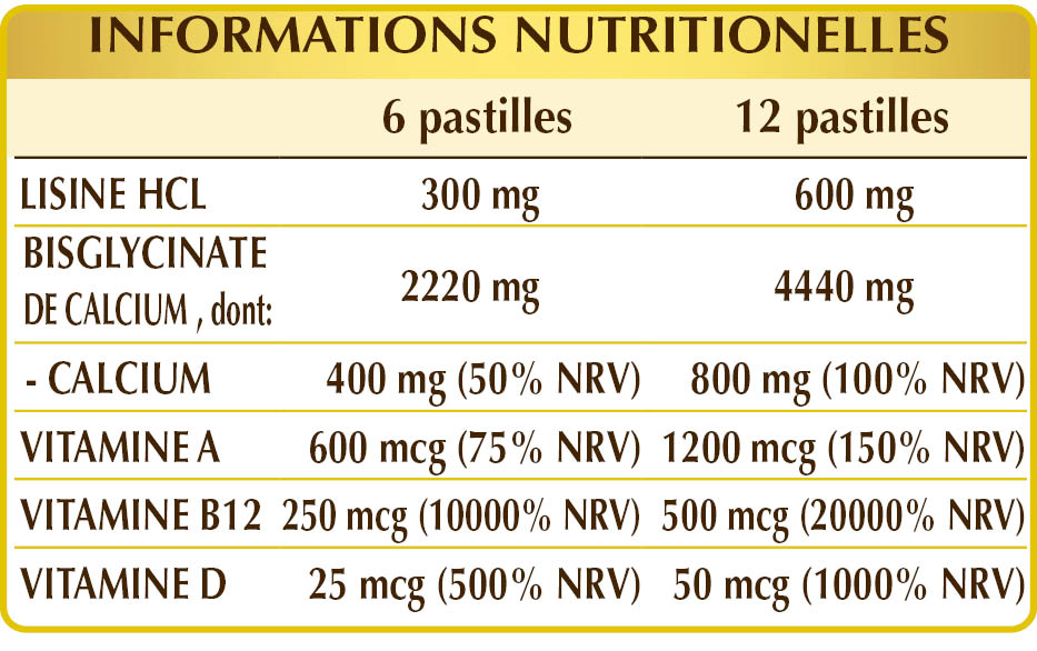 Bisglycinate de calcium, (L-)lysine HCL ou chlorhydrate, gomme arabique°, cellulose microcristalline°, stéarate de magnésium d’origine végétale°°, lichen (Cladonia rangiferina) thalle E.S. (titré en vitamine D3 cholécalciférol 100 000 UI/g), vitamine A (acétate de rétinyle 500 000 UI/g), vitamine B12 activée (5-désoxyadénosylcobalamine, méthylcobalamine)