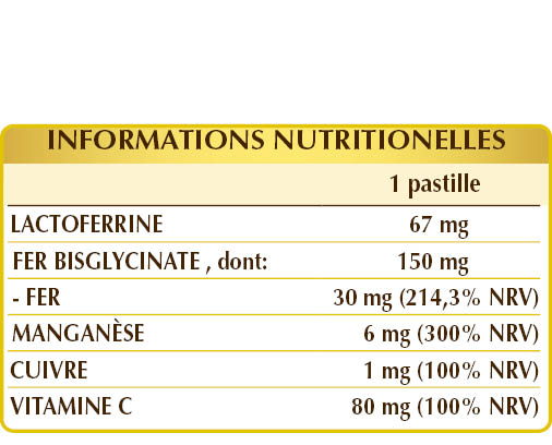 Bisglycinate de fer, vitamine C (acide ascorbique), lactoferrine de lait de vache, cellulose microcristalline°, gluconate de manganèse, gomme arabique°°, stéarate de magnésium d’origine végétale°, dioxyde de silicium°°, gluconate de cuivre.