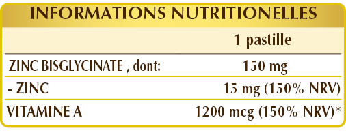 Complément alimentaire à base de zinc sous forme organique chélatée à haute biodisponibilité, enrichi en vitamine A. Le zinc protège les cellules du stress oxydatif, contribue à la synthèse normale de l’ADN et des protéines et participe au métabolisme acido-basique ainsi qu’à celui des macronutriments (glucides et acides gras). Il soutient également la fonction cognitive, favorise la santé des os, des ongles et des cheveux, et contribue à la fertilité masculine en maintenant des niveaux normaux de testostérone dans le sang. Associée à la vitamine A, elle favorise le bon fonctionnement du système immunitaire et contribue au maintien normal de la peau et de la vision. Il intervient enfin dans le processus de division cellulaire et contribue au métabolisme de la vitamine A, qui, elle, participe au processus de spécialisation des cellules.