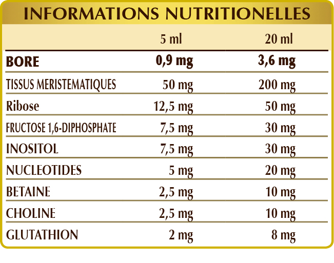 Glycérine végétale bidistillée, eau pure; macérât glycériné tissus méristématiques frais : genévrier (Juniperus communis) jeunes pousses, pin de montagne (Pinus montana, synonyme Pinus mugo ou Pinus pumilio) bourgeons, vigne vierge (Ampelopsis veitchii, synonyme Parthenocissus tricuspidata) jeunes pousses; ribose, fructose-1,6-diphosphate; régulateur d'acidité: acide citrique; borate de sodium, inositol, citrate de bétaïne, tartrate de choline; mélange de nucléotides: AMP (adénosine monophosphate), CMP (cytidine monophosphate), GMP (guanosine monophosphate), UMP (uridine monophosphate); glutathion réduit ; édulcorant d'origine naturelle: thaumatine (E957). Édulcoré uniquement avec des édulcorants d'origine naturelle.