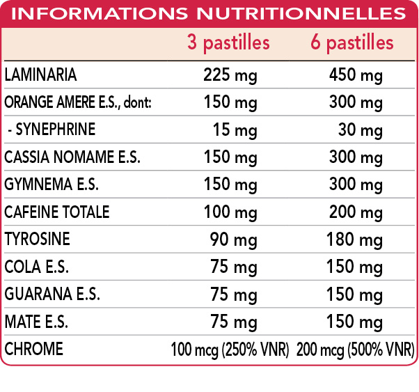 Cellulose microcristalline°, laminaire (Laminaria digitata) thalle (algue) poudre, orange amère (Citrus aurantium var. amara) écorces des fruits immatures E.S. (standardisé à 10% de synéphrine), cassia nomame (Cassia mimosoides var. nomame makino) feuilles E.S. (standardisé à 8% de dimères flavaniques), gymnema (Gymnema sylvestre) feuilles E.S. (standardisé à 75% d’acide gymnémique), gomme arabique°, (L-)tyrosine, graines de cola (Cola acuminata) E.S. (standardisé à 10% de caféine), graines de guarana (Paullinia cupana) E.S. (standardisé à 50% de bêta-sitostérols, maté (Ilex paraguariensis) feuilles E.S. (standardisé à 8% de caféine), dioxyde de silicium°°, caféine, stéarate de magnésium d'origine végétale°°, picolinate de chrome.
