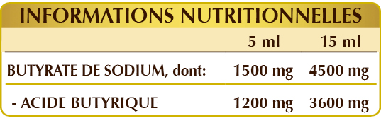 Supplément de butyrate de sodium, source d'acide butyrique.