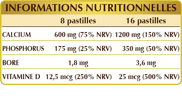 Complément alimentaire riche en calcium, avec du phosphore, du bore et de la vitamine D. La vitamine D favorise l’absorption et l'utilisation du calcium et du phosphore, qui, associés à elle, contribuent au maintien d'os et de dents normaux. Le calcium peut être utile pour réduire la perte de minéraux osseux chez les femmes ménopausées de 50 ans et plus, chez qui une faible densité minérale osseuse constitue un facteur de risque pour les fractures ostéoporotiques*. Le calcium et la vitamine D contribuent également au maintien de la fonction musculaire et interviennent dans les processus de division cellulaire. Le calcium favorise enfin une bonne neurotransmission et coagulation sanguine, en association avec le phosphore, ils renforcent le métabolisme énergétique.