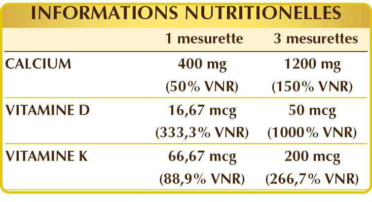 Complément alimentaire riche en calcium et en vitamines D et K.Le calcium contribue à une neurotransmission normale, à une coagulation sanguine régulière, à un métabolisme énergétique normal et, avec les vitamines D et K, favorise le maintien normal de la santé osseuse. La vitamine D favorise l'absorption et l'utilisation du calcium et du phosphore et contribue au bon fonctionnement du système immunitaire ; en association avec le calcium, ils permettent de préserver la fonction musculaire et interviennent dans les processus de division cellulaire.