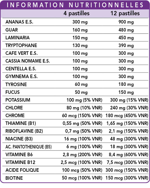 Ananas (Ananas comosus) tiges des fruits E.S. (titré à 2500 GDU/g de broméline), cellulose microcristalline°, chlorure de potassium, gomme arabique°, gomme de guar (Cyamopsis tetragonoloba) graines Pulv, laminaria (Laminaria digitata) thalle (algue) Pulv, (L-)Tryptophane, caféier (Coffea arabica) graines vertes (non torréfiés) E.S. (standardisé à 50% d’acide chlorogénique et 2% de caféine), cassia nomame (Cassia mimosoides var. nomame makino) feuilles E.S. (standardisé à 8% de dimères flavaniques), centella (Centella asiatica) herbe E.S. (standardisé à 20 % de dérivés triterpéniques totaux, calculés comme l'asiaticoside), gymnéma (Gymnema sylvestre) fruits E.S. (standardisé à 75 % en acide gymnémique), (L-)tyrosine, fucus ou varech (Fucus vesiculosus) thalle (algue) Pdr, citrate de potassium, dioxyde de silicium, stéarate de magnésium d’origine végétale, vitamine B3 (nicotinamide), vitamine B5 (pantothénate de calcium), vitamine B6 activée (phosphate de pyridoxal-5), vitamine B2 activée (phosphate de riboflavine sodique), vitamine B1 (chlorhydrate de thiamine), picolinate de chrome, acide folique activé (L-méthylfolate de calcium), biotine, vitamine B12 activée (5-désoxyadénosylcobalamine, méthylcobalamine). Pulv. = Poudre °Agent de charge °° Agent antiagglomérant