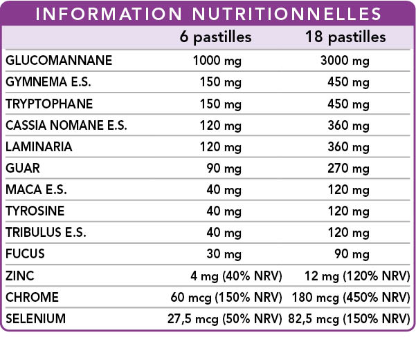 Le glucomannane favorise la perte de poids*. La gomme de guar procure une sensation de satiété et permet de limiter l’absorption des nutriments. Le gymnema aide à contrôler la sensation de faim. La laminaire et le fucus stimulent le métabolisme. Le cassia noname renforce le métabolisme des triglycérides et du cholestérol. Le gymnema renforce celui des glucides et, en association avec le fucus, intervient dans le métabolisme des lipides. Le cassia noname et le fucus maintiennent l'équilibre du poids corporel tandis que la maca et le tribulus ont une action tonique utile pour lutter contre la fatigue physique et mentale. Le sélénium favorise la spermatogenèse tandis que le zinc contribue à maintenir des niveaux réguliers de testostérone dans le sang en favorisant la reproduction et la fertilité masculines.