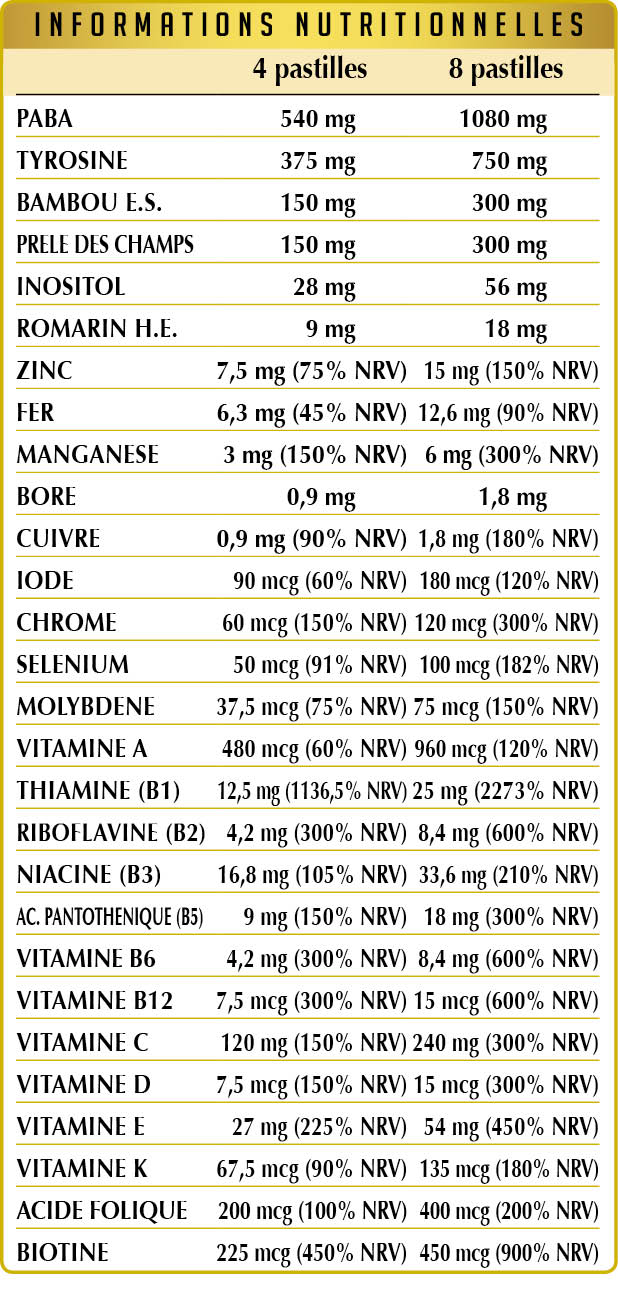 PABA (acide p-aminobenzoïque), (L-)tyrosine, cellulose microcristalline°, gomme arabique°, jeunes tiges de bambou (Bambusa vulgaris) E.S. (titré à 70% en silice), prêle de champs (Equisetum arvense) poudre de plante, vitamine C (acide ascorbique), gluconate de zinc, vitamine E d'origine végétale (acétate de D-α-tocophéryle), gluconate de fer, dioxyde de silicium°°, myo-inositol d'origine végétale (extrait de graines de maïs), gluconate de manganèse, vitamine B3 (nicotinamide), vitamine B1 (chlorhydrate de thiamine), stéarate de magnésium d'origine végétale°°, vitamine B5 (pantothénate de calcium), romarin (Rosmarinus officinalis) sommités fleuries H.E., borate de sodium, vitamine B2 activée (riboflavine 5'-phosphate de sodium), vitamine B6 activée (pyridoxal-5'-phosphate), gluconate de cuivre, vitamine A (acétate de rétinyle), lichen (Cladonia rangiferina) thalle E.S. (titré en vitamine D3 cholécalciférol 100 000 UI/g), picolinate de chrome, acide folique, biotine, acide folique activé (L-méthylfolate de calcium), iodure de potassium, sélénite de sodium, molybdate de sodium, vitamine K1 (phylloquinone), vitamine B12 activée (méthylcobalamine, 5-désoxyadénosylcobalamine).