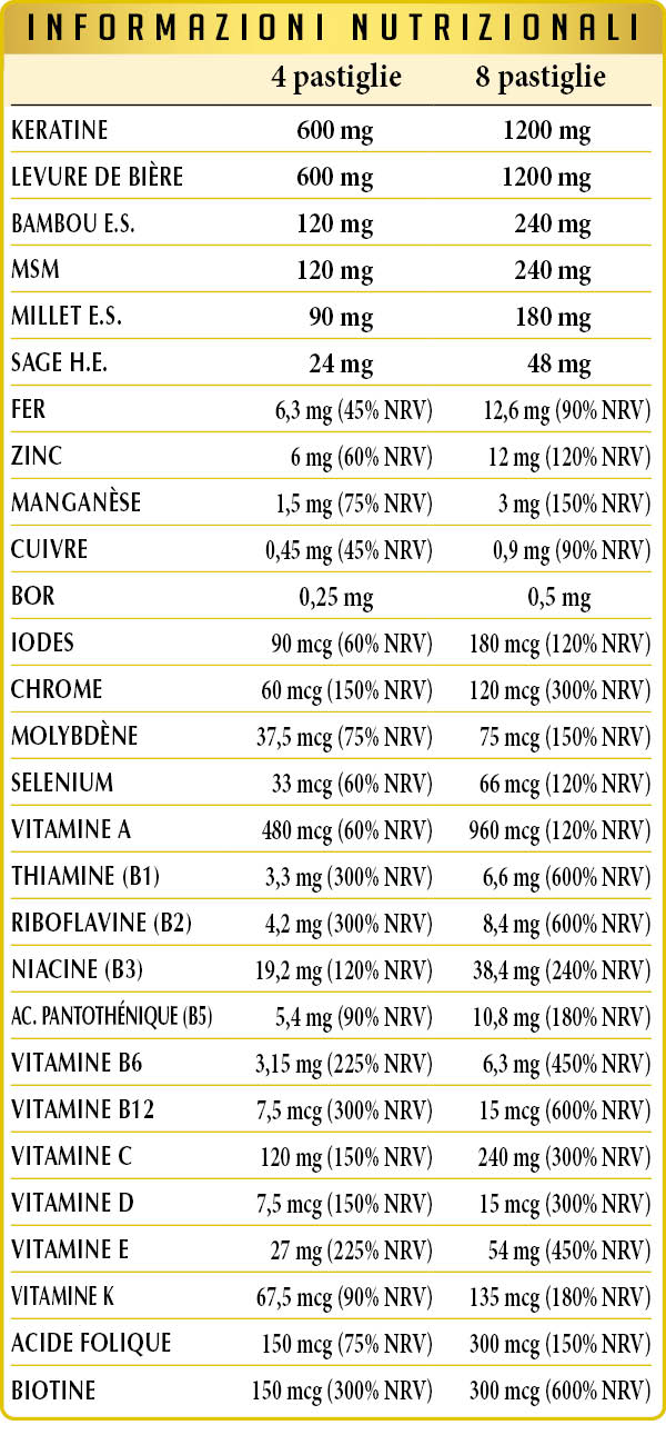 Kératine hydrolysée, levure de bière (Saccharomyces cerevisiae), cellulose microcristalline°, gomme arabique°, bambou (Bambusa vulgaris) tiges jeunes E.S. (standardisé à 70% en silice), MSM (méthylsulfonylméthane), vitamine C (acide ascorbique), millet (Panicum miliaceum) graines E.S., vitamine E d'origine végétale (acétate de D-α-tocophérol), gluconate de fer, gluconate de zinc, dioxyde de silicium°°, sauge (Salvia officinalis) feuilles O.E., vitamine B3 (nicotinamide), gluconate de manganèse, stéarate de magnésium d'origine végétale°°, borate de sodium, vitamine B2 activée (riboflavine 5-phosphate de sodium), vitamine B5 (pantothénate de calcium), vitamine B6 activée (pyridoxal-5-phosphate), vitamine B1 (chlorhydrate de thiamine), gluconate de cuivre, vitamine A (acétate de rétinyle), lichen (Cladonia rangiferina) thalle E.S. (standardisé en vitamine D3 cholécalciférol 100 000 UI/g), picolinate de chrome, acide folique activé (L-méthylfolate de calcium), biotine, iodure de potassium, molybdate de sodium, sélénite de sodium, vitamine K1 (phylloquinone), vitamine B12 (5-désoxyadénosylcobalamine, méthylcobalamine). °Agent de charge. °°Antiagglomerante.