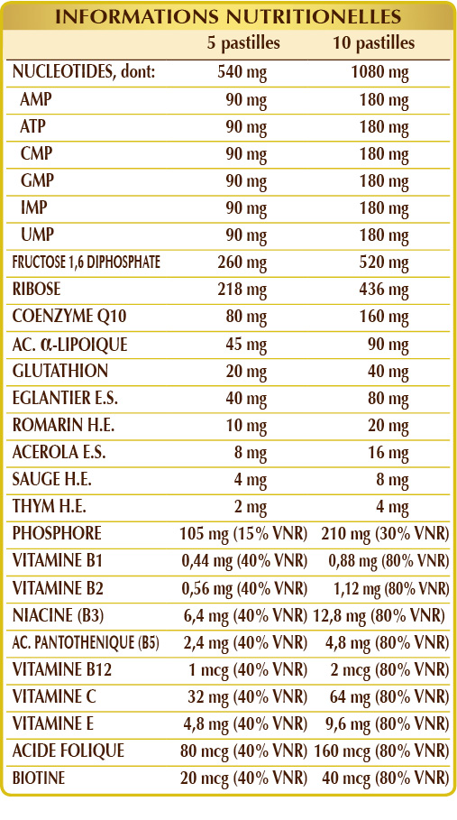 Mélange de nucléotides: AMP (adénosine monophosphate), ATP (adénosine triphosphate), CMP (cytosine monophosphate), GMP (guanosine monophosphate), IMP (inosine monophosphate), UMP (uridine monophosphate); diphosphate de fructose 1,6, cellulose microcristalline°, gomme arabique°, ribose, coenzyme Q10, acide α-lipoïque, églantier (Rosa canina) fruits E.S. (titré à 70% en vitamine C), glutathion, dioxyde de silicium°°, stéarate de magnésium d'origine végétale°°, vitamine E d'origine végétale (acétate de D-α-tocophéryl), sommités fleuries de romarin (Rosmarinus officinalis) H.E., sorbitol, acérola (Malpighia glabra) fruits E.S., (titrée à 50% en vitamine C), vitamine B3 (nicotinamide), sauge (Salvia officinalis) feuilles H.E., vitamine B5 (pantothénate de calcium), feuilles de thym vulgaris (Thymus vulgaris) O.E., vitamine B2 (riboflavine), vitamine B6 (chlorhydrate de pyridoxine), vitamine B1 (chlorhydrate de thiamine), acide folique, biotine, vitamine B12 (cyanocobalamine).