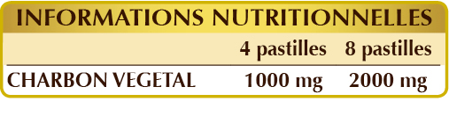 *L'effet bénéfique peut être obtenu avec la prise d'au moins 1 g de charbon végétal 30 minutes avant le repas et de 1 g immédiatement après.