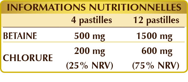 Supplément de chlorure et de bétaïne. Le chlorure favorise la fonction digestive grâce à la production normale d'acide chlorhydrique dans l'estomac tandis que la bétaïne contribue au métabolisme normal de l'homocystéine*.
