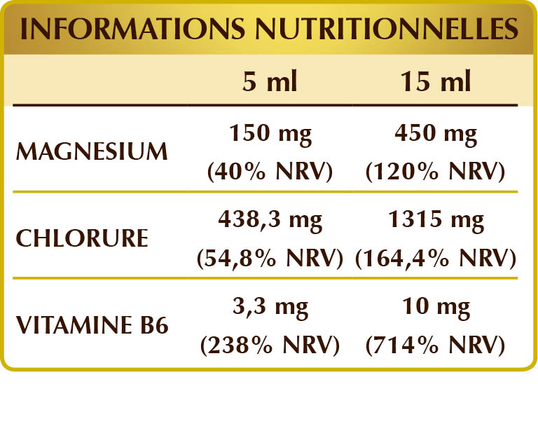 Eau, glycérine, chlorure de magnésium hexahydraté ; édulcorants d'origine naturelle : érythritol, glycosides de stéviol de stévia, thaumatine ; vitamine B6 activée (pyridoxal 5-phosphate).