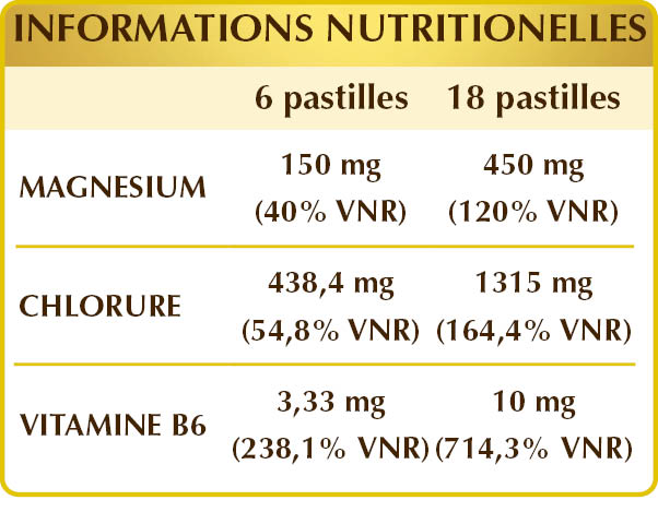 Chlorure de magnésium hexahydraté, dioxyde de silicium°°, gomme arabique°, cellulose microcristalline°, stéarate de magnésium d’origine végétale°°, vitamine B6 activée (pyridoxal-5-phosphate).