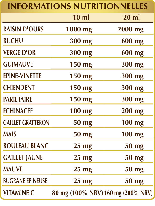 Glycérine végétale bi-distillée, eau pure, raisin d'ours (Arctostaphylos uva-ursi) feuilles E.I.L., buchu (Barosma betulina) feuilles E.I.L., verge d’or (Solidago virga-aurea) herbe avec des fleurs, guimauve (Althaea officinalis) racines E.I.L., vinettier (Berberis vulgaris) écorces des racines E.I.L., chiendent (Agropyron repens) rhizomes E.I.L., pariétaire (Parietaria officinalis) herbe E.I.L., ascorbate de potassium, échinacée (Echinacea angustifolia, pallida et purpurea) racines E.I.L., bicarbonate de potassium, gaillet gratteron (Galium aparine) herbe avec des fleurs E.I.L., maïs ou blé de Turquie (Zea mays) stigmates E.I.L., bouleau blanc (Betula alba ou pubescens) feuilles E.I.L., gaillet jaune (Galium verum) herbe avec des fleurs E.I.L., grande mauve (Malva sylvestris) feuilles E.I.L., bugrane épineuse (Ononis spinosa) racines E.I.L.; édulcorants d'origine naturelle: glycosides de Steviol et thaumatine.