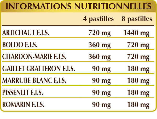 Artichaut (Cynara scolymus) feuilles E.I.S., boldo (Peumus boldus) feuilles E.I.S., chardon-Marie (Silybum marianum) fruits E.I.S., cellulose microcristalline°, gomme arabique°, marrube blanc (Marrubium vulgare) herbe avec des fleurs E.I.S., pissenlit (Taraxacum officinale) racines E.I.S., gaillet gratteron (Galium aparine) herbe avec des fleurs E.I.S., romarin (Rosmarinus officinalis) feuilles E.I.S., dioxyde de silicium°°, stéarate de magnésium d'origine végétale°°.