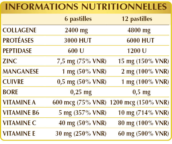 Collagène bovin hydrolysé, cellulose microcristalline°, gomme arabique°, vitamine E d'origine végétale (acétate de D-α-tocophérol), gluconate de zinc, vitamine C (acide ascorbique), dioxyde de silice°°, gluconate de manganèse, vitamine B6 activée (pyridoxal-5-phosphate), protéase (500 000 HUT/g), vitamine A (acétate de rétinyle), gluconate de cuivre, peptidase (200 000 U/g), stéarate de magnésium d'origine végétale°°, borate de sodium.