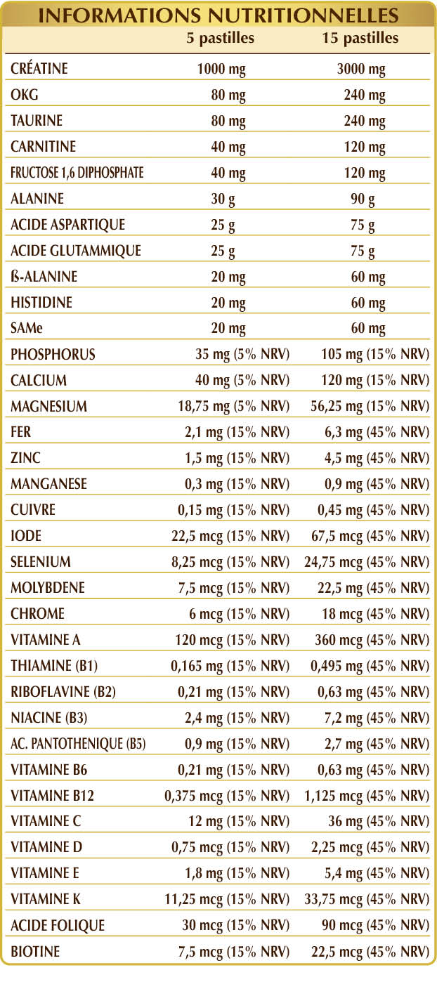 Créatine monohydratée, cellulose microcristalline°, gomme arabique°, phosphate dicalcique, taurine, (L-)ornithine-α-cétoglutarate (OKG), phosphate de créatine, chlorhydrate d'acétyl (L-)carnitine, dioxyde de silicium°°, glycérophosphate de calcium, fructose 1,6-diphosphate, SAMe (S-adénosylméthionine disulfate tosylate), (L-)alanine, glycérophosphate de magnésium, oxyde de magnésium, acide (L-)aspartique, acide (L-)glutamique, ß-alanine, (L-)histidine, gluconate de fer, ascorbate de potassium, stéarate de magnésium d'origine végétale°°, gluconate de zinc, vitamine E d'origine végétale (acétate de D-α-tocophéryle), vitamine B3 (inositol hexanicotinate), gluconate de manganèse, gluconate de cuivre, vitamine B5 (pantothénate de calcium), vitamine A (acétate de rétinyle), vitamine B2 activée (riboflavine 5-phosphate de sodium), vitamine B6 activée (pyridoxal-5-phosphate), lichen (Cladonia rangiferina) thalle, E.S. (standardisé en vitamine D3 cholécalciférol 100 000 UI/g), vitamine B1 (chlorhydrate de thiamine), picolinate de chrome, acide folique activé (L-méthylfolate de calcium), potassium iodure, sélénite de sodium, vitamine K1 (phyloquinone), biotine, vitamine B12 activée (5'-désoxyadénosylcobalamine, méthylcobalamine). E.S. = Extrait Sec °Agent de charge. °°Antiagglomerante.