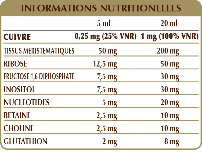 Glycérine végétale bi-distillée, eau pure; tissus méristématiques frais : genévrier (Juniperus communis) jeunes pousses, frêne commun (Fraxinus excelsior) bourgeons, églantier (Rosa canina) jeunes pousses, prunellier (Prunus spinosa) bourgeons; ribose, fructose 1,6 diphosphate; correcteur d'acidité: acide citrique; inositol, citrate de bétaïne, tartrate de choline; mélange de nucléotides: AMP (adénosine monophosphate), CMP (cytidine monophosphate), GMP (guanosine monophosphate), UMP (uridine monophosphate) ; glutathion, gluconate de cuivre ; édulcorant d'origine naturelle : thaumatine. Édulcoré uniquement avec des édulcorants d'origine naturelle.