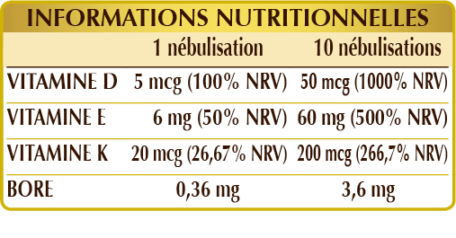 Complément alimentaire de vitamine D en spray, contenant vitamines E, K et bore. La vitamine D contribue à l'absorption normale du calcium et du phosphore, à la fonction musculaire normale, au maintien de dents saines, au processus de division cellulaire et au fonctionnement régulier du système immunitaire. Avec la vitamine K, il favorise le maintien de la santé des os. De plus, la vitamine K aide à la coagulation sanguine normale tandis que la vitamine E contribue à la protection des cellules contre le stress oxydatif.
