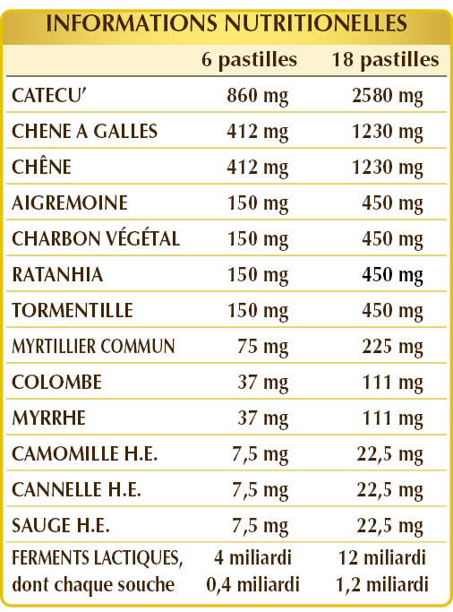 Catechu (Acacia catechu) gomme Plv, noix de galle (Quercus infectoria) galles Plv, chêne (Quercus robur) écorces Plv, cellulose microcristalline°, gomme arabique°, aigremoine (Agrimonia eupatoria) herbe Plv, charbon végétal pur (Carbo vegetabilis) issu du bois Plv, ratanhia (Krameria triandra) racines Plv, tormentille (Potentilla erecta) rhizomes Plv, myrtille noire (Vaccinium myrtillus) fruits Plv, dioxyde de silicium°°, colombo (Jateorhiza palmata) racines Plv, myrrhe (Commiphora myrrha) gomme-résine Plv, mélange de ferments lactiques (titres à 10% pour chacun des souches suivantes: Bifidobacterium bifidum SD5215, breve SD5206, lactis SD5219; Lactobacillus acidophilus SD5212, brevis SD5214, bulgaricus SD5589, casei SD5213, paracasei SD5275, plantarum SD5209, rhamnosus SD5217), camomille romaine (Anthemis nobilis) têtes des fleurs H.E., cannelle (Cinnamomum zeylanicum) écorces H.E., sauge (Salvia officinalis) feuilles H.E., stéarate de magnésium d’origine végétale°°. Pulv. = Poudre °Agent de charge. °°Antiagglomerante.