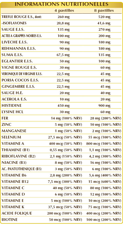 (L-)histidine, trèfle rouge (Trifolium pratense) fleurs E.S. (titré à 8% d'isoflavones), cellulose microcristalline°, gomme arabique°, sauge (Salvia officinalis) feuilles E.I.S., actée à grappes noires (Cimicifuga racemosa) rhizomes E.S. (titré à 2,5% de glycosides triterpéniques), citrate d'ammonium ferrique, livèche ou ache de montagne (Levisticum officinale) racines E.I.S., rehmannia (Rehmannia glutinosa) racines E.I.S., suma ou ginseng brésilien (Pfaffia paniculata) racines E.I.S., dioxyde de silicium°°, églantier (Rosa canina) fruits E.I.S. (titré à 70% de vitamine C), gluconate de zinc, (L-)lysine HCL ou chlorhydrate, vigne rouge (Vitis vinifera) pépins de raisin E.S. (titré à 95% de proanthocyanidines oligomères), véronique de virginie (Leptandra virginica) rhizomes E.I.S., poria cocos (Poria cocos) sclérote (champignon) E.I.S., gingembre (Zingiber officinalis) rhizomes E.I.S., sauge (Salvia officinalis) feuilles H.E., vitamine E d'origine naturelle (acétate de D-α-tocophéryle), acérola (Malpighia glabra) fruits E.S. (titré à 50% de vitamine C), stéarate de magnésium d'origine végétale°°, gluconate de manganèse, vitamine B3 (nicotinamide) vitamine B6 activée (pyridoxal-5-phosphate), vitamine B2 activée (riboflavine 5-phosphate de sodium), vitamine B5 (pantothénate de calcium), vitamine A (acétate de rétinyle), lichen (Cladonia rangiferina) thalle E.S. (titré en vitamine D3 cholécalciférol 100 000 UI/g), vitamine B1 (chlorhydrate de thiamine), acide folique activé (L-méthylfolate de calcium), sélénite de sodium, biotine, vitamine K1 (phylloquinone), vitamine B12 activée (5-désoxyadénosylcobalamine, méthylcobalamine).