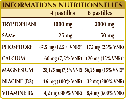 (L-)Tryptophane, phosphate de calcium dibasique, glycérophosphate de magnésium, cellulose microcristalline°, gomme arabique°, dioxyde de silicium°°, SAMe (S-adénosylméthionine disulfate tosylate), vitamine B3 (nicotinamide), vitamine B6 activée (pyridoxal-5-phosphate), stéarate de magnésium d'origine végétale°°.