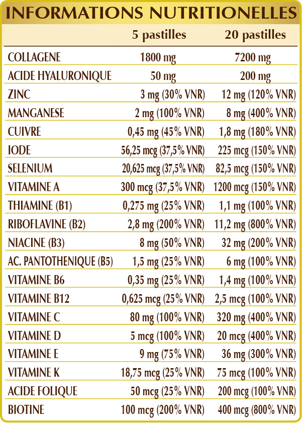 Collagène bovin hydrolysé, cellulose microcristalline°, gomme arabique°, vitamine C (acide ascorbique), hyaluronate de sodium, dioxyde de silicium°°, gluconate de zinc, gluconate de manganèse, vitamine E d'origine végétale (acétate de D-α-tocophéryle), stéarate de magnésium d'origine végétale°°, vitamine B2 activée (riboflavine 5-phosphate de sodium), vitamine B3 (nicotinamide), gluconate de cuivre, lichen (Cladonia rangiferina) thalle D.E. (standardisé en vitamine D3 cholécalciférol 100 000 UI/g), vitamine A (acétate de rétinyle), vitamine B5 (pantothénate de calcium), vitamine B6 activée (pyridoxal-5-phosphate), vitamine B1 (chlorhydrate de thiamine), biotine, iodure de potassium, acide folique activé (L-méthylfolate de calcium), sélénite de sodium, vitamine K1 (phylloquinone), vitamine B12 activée (5-désoxyadénosylcobalamine, méthylcobalamine). E.S. = Extrait Sec °Agent de charge. °°Antiagglomerante.