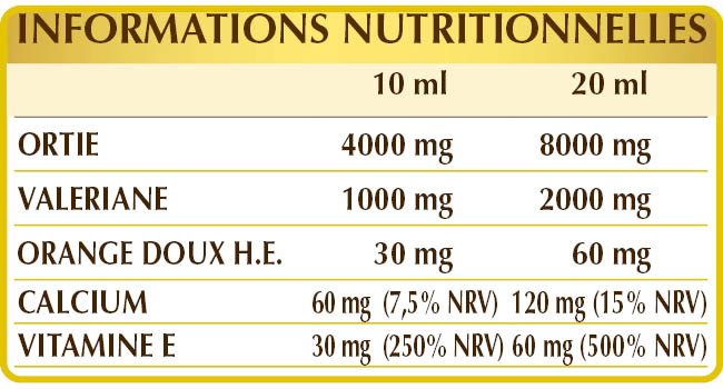 Glycérine végétale bidistillée, eau purifiée, ortie (Urtica dioica) parties aériennes E.I.L., valériane (Valeriana officinalis) racines E.I.L., lactate de calcium, vitamine E (acétate de DL-α-tocophérolCitrus aurantium var. sinensis ou dulcis) zestes H.E. ; édulcorants d’origine naturelle : glycosides de stéviol issus de stevia, thaumatine.