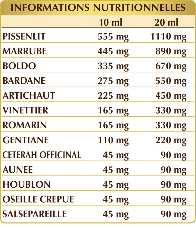 Glycérine végétale bi-distillée, eau pure, pissenlit (Taraxacum officinale) racines E.I.L., marrube (Marrubium vulgare) herbe avec des fleurs E.I.L., boldo (Peumus boldus) feuilles E.I.L., bardane (Arctium lappa) herbe et racines fraîches E.I.L., artichaut (Cynara scolymus) feuilles E.I.L., vinettier (Berberis vulgaris) écorces des racines E.I.L., romarin (Rosmarinus officinalis) feuilles E.I.L., gentiane (Gentiana lutea) racines E.I.L., cétérah officinal ou herbe dorée (Ceterach officinarum) feuilles E.I.L., elecampane (Inula helenium) racines E.I.L., houblon (Humulus lupulus) cônes (fleurs femelles) E.I.L., oseille crépue (Rumex crispus) racines E.I.L., salsepareille (Smilax medica) racines E.I.L.