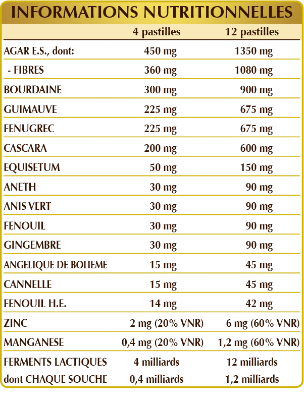 Agar-agar (Gelidium amansii) thalle (algue) E.S., bourdaine (Rhamnus frangula) écorces Pulv., guimauve (Althaea officinalis) racines Pulv., fenugrec (Trigonella foenum-graecum) graines Pulv., cascara (Rhamnus purshiana) écorces Pulv., cellulose microcristalline°, gomme arabique°, prêle des champs ou queue de cheval (Equisetum arvense) herbe Pulv., aneth (Anethum graveolens) fruits Pulv., anis vert (Pimpinella anisum) fruits Pulv., fenouil (Foeniculum vulgare) fruits Pulv., gingembre (Zingiber officinalis) rhizomes Pulv., dioxyde de silicium°°, mélange de ferments lactiques vivants (normalisé à 10% dans chacune de souches suivantes: Bifidobacterium bifidum SD5215, breve SD5206, lactis SD5219; Lactobacillus acidophilus SD5212, brevis SD5214, bulgaricus SD5589, casei SD5213, paracasei SD5275, plantarum SD5209, rhamnosus SD5217), gluconate de zinc, Angélique de Bohême (Angelica archangelica) racines Pulv., cannelle (Cinnamomum zeylanicum) écorces Pulv., fenouil (Foeniculum vulgare) fruits H.E., gluconate de manganèse, stéarate de magnésium d’origine végétale°°.