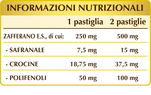 Zafferano (Crocus sativus) stigmi E.S. (titolato al 3% in safranale, 7.5% in crocine e 20% in polifenoli), maltodestrine da mais o riso, cellulosa microcristallina°, gomma arabica°, silicio biossido°°, magnesio stearato di origine vegetale°°.