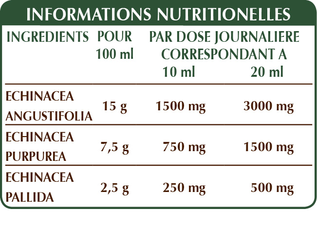 Extrait Intégral Liquide non alcoolisé obtenu à partir de : glycérine végétale bidistillée, eau pure, échinacée (Echinacea angustifolia, purpurea et pallida) racines.