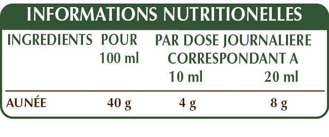 Extrait intégral liquide sans alcool obtenu à partir de : glycérine végétale bidistillée, eau pure, aunée (Inula helenium).