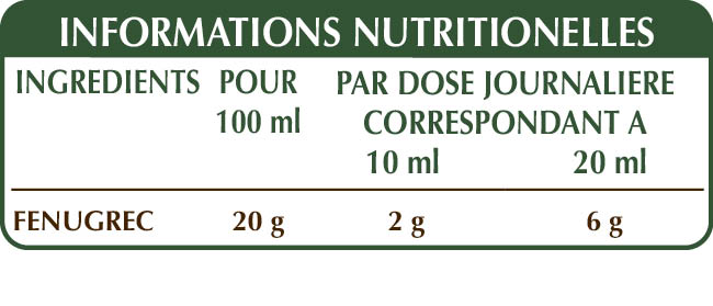 Extrait Intégral Liquide non alcoolisé obtenu à partir de : glycérine végétale bidistillée, eau pure, graines de fenugrec (Trigonella foenum-graecum).