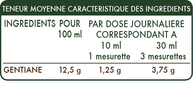 Extrait Intégral Liquide non alcoolisé obtenu à partir de : glycérine végétale bidistillée, eau pure, racines de gentiane (Gentiana lutea).
