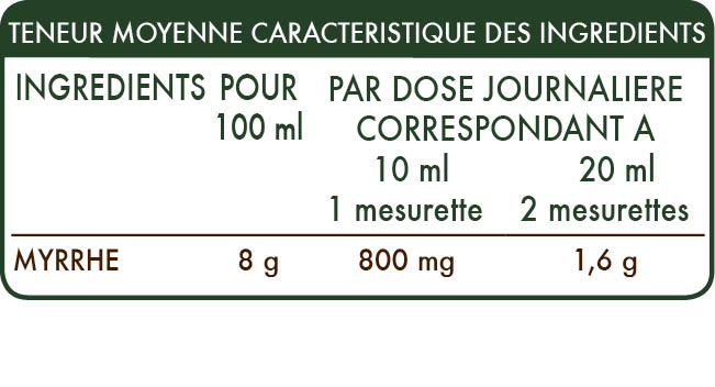 La myrrhe contribue au bon fonctionnement de la muqueuse oropharyngée ainsi qu'à celui du système digestif.