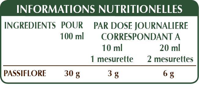 Glycérine végétale bi-distillée, eau pure, passiflore (Passiflora incarnata) herbe avec fleurs.