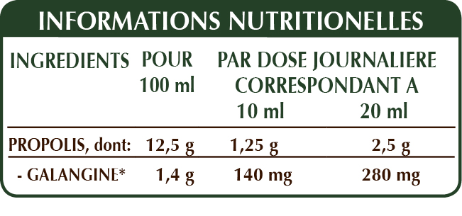 Extrait Intégral Liquide non alcoolisé obtenu à partir de : glycérine végétale bidistillée, eau pure, rèsine de propolis (Propolis).